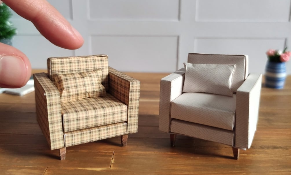 Print-ready PDF files for making a paper armchair in 1:12 and 1:24 scale in beige pattern